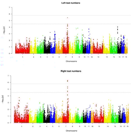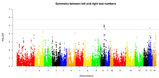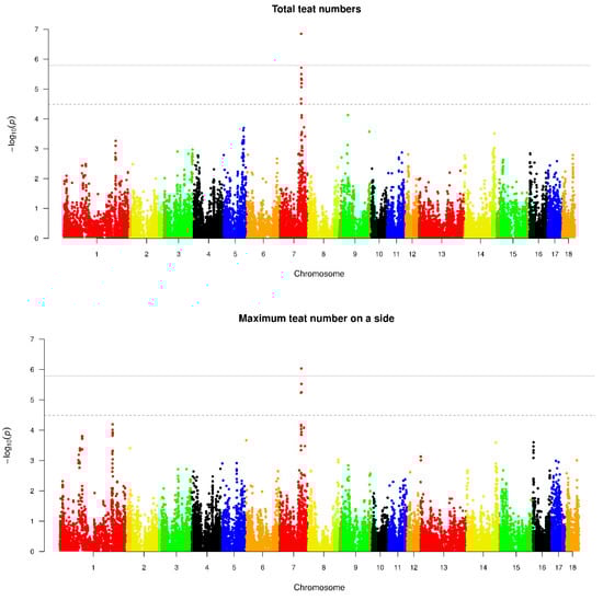 The teat number, unlike other reproductive traits, is an inborn trait that is less affected by environmental factors [3]. Heritabilities of TN in pig populations ranged from 0.10 to 0.70 even though most of them tend to converge on a moderate value for this trait [4,5,6,7,8,9]. Zhuang et al. reported that heritabilities of Canadian Duroc and American Duroc were 0.34 and 0.19, respectively [9]. The number of teats can vary in different pig breeds, ranging from 8 to 25. The largest total number of NT of 25 has been documented in Erhualian pig that is one of Chinese indigenous pig breeds [10]. However, the number of teats of Duroc ranges from 8 to 16 [9,11]. Breeding programs have achieved remarkable improvements in litter sizes of pigs in the last few decades. In 2009, about one-quarter of the largest litter size of purebred Danish Large White and Landrace pigs were larger than 18 [12]. The increased litter size in pigs has led to many sows incapable of nurturing all of their piglets owing to the limited. The sucking piglet competition for teats results in increased preweaning mortality because of starvation and crushing [13]. Therefore, NT should be added in breeding project to ensure that sows can raise all their piglets to increase the number of piglets per sow per year [14,15,16].