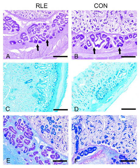 The appearance of the duodenum of the two experimental groups did not reveal morphological differences. We observed small intestine villi covered by a simple columnar epithelium, with goblet cells and simple tubular glands; at the base of epithelial villi, the crypts of Lieberkuhn are visible. The submucosa is predominantly occupied by Brunner’s glands. We observed PAS staining in control and treated animals in the globet cells, the crypts of Lieberkuhn, and Brunner’s glands (Figure 1A,B). In treated animals, the staining in the Brunner’s glands appeared weaker (Figure 1B). Similarly, goblet cells and duodenal submucosal glands were stained with Alcian blue (Figure 1C,D) at pH 2.5 and Alcian-Pas (Figure 1E,F) in both experimental groups. This pattern was confirmed when conducting Alcian-PAS staining, which revealed weaker staining either in the globet cells and Brunner’s glands in Group RLE compared to CON animals (Figure 1E,F).
