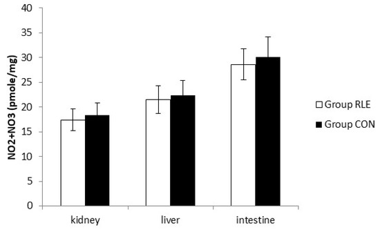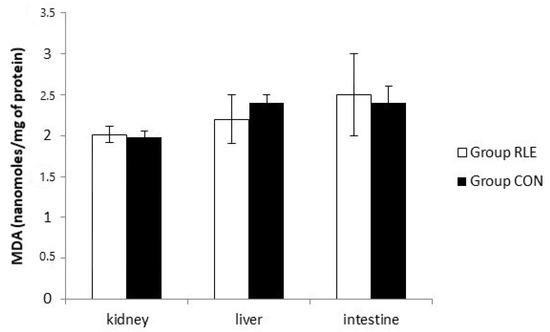 No significant difference in the SOD activity was observed in the renal tissue about Group RLE and Group CON at the end of treatment. The same result was observed in the liver and intestine (Table 7). The CAT activity of all tissues did not change in Group RLE with respect to Group CON at the end of treatment (Table 7). Moreover, RLE did not affect GPx activity of the kidney, liver, and intestine (Table 7).