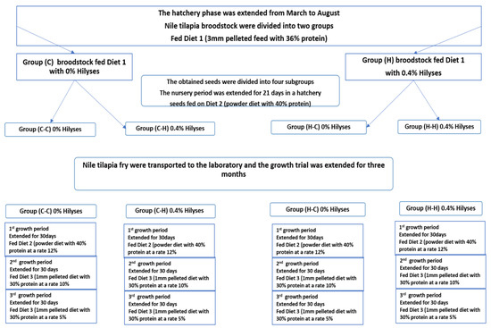 The laboratory phase was performed to evaluate the growth performance and feed utilization of Nile tilapia fry. The previously mentioned four treatment groups (C-C, C-H, H-C, H-H) with an average body weight of 118.8 ± 1.3 mg were allocated to 12 aquaria (30 × 40 × 100 cm) in triplicate at 20 fry/replicate. The aquaria were supplemented with aeriation and a thermostable thermometer adjusted to 26 °C. They were fed three times/day for three months [37]. Figure 1 is a summary of experimental design.