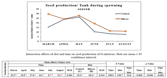 Figure 2 depicts the effect of both Hilyses supplementation and time on the seed production during the spawning season (March to August). Overall, the data revealed that the main effects of both factors Hilyses supplementation and time were significant (p < 0.05) for seed production of O. niloticus broodstock. Moreover, the interaction between the two factors was significant (p < 0.05). Generally, seed production is gradually increased at the beginning of the spawning season (March to May) followed by a sharp decrease in June, then maintaining the plateau till the end of the spawning season. Whereas Hilyses supplementation to broodstock diet during the spawning period caused a gradual decrease of seed production over the period from May to July. By the end of that period, a higher level than that of the control group was shown in August.