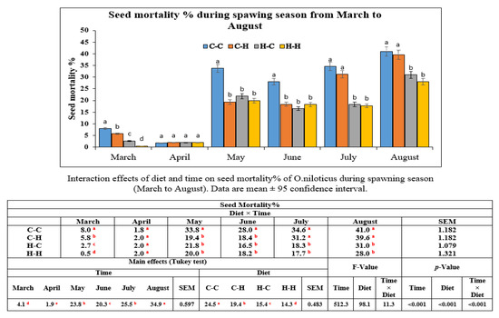Regarding the seed mortality of O. niloticus during the spawning season, the results are illustrated in Figure 3. At first glance, the data showed that the main effects of both factors Hilyses supplementation and time were significant (p < 0.05) for the seed mortality of O. niloticus broodstock. Additionally, the interaction between the two factors was significant (p < 0.05). There is a direct relationship between time and seed mortality: the percentage of seed mortality increases over the period from May to August. Hilyses had the ability to decrease the percentage of seed mortality in all supplemented groups (C-H, H-C, and H-H) compared with C-C group over the period from May to June. Moreover, at the period from July till the end of spawning season the effect of Hilyses on seed mortality was clear in (H-C and H-H) groups rather than (C-H) group which had mortality % nearly the same as that of (C-C) group.