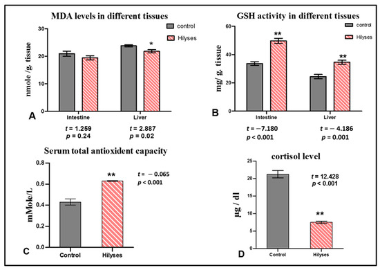 Oxidant and antioxidant biomarkers and cortisol levels in both broodstock groups. (A). Malondialdehyde lipid peroxide (MDA) levels in the intestine and liver of the control and Hilyses groups; (B). Intestinal and hepatic reduced glutathione (GSH) activity of the control and Hilyses groups; (C). Serum total antioxidant capacity of the control and Hilyses groups; (D). Cortisol activity of the control and Hilyses groups. The results were statistically analyzed by independent samples’ t test and expressed as the mean ± S.E. (n = 10). * statistically significant (p < 0.05), ** Statistically highly significant (p < 0.01) compared to the control group.