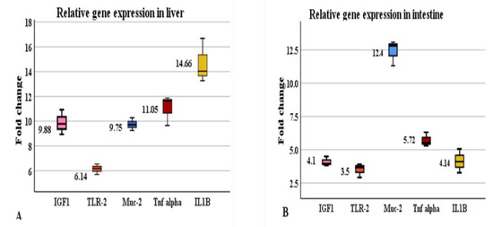 The expression of genes is represented as the fold increase in Hilyses treated group in comparison to control group. Genes such as IGF-1, TLR-2, MUC-2, TNF-α and IL-1β were upregulated in the liver and intestine tissues in response to Hilyses supplementation (Figure 5A,B). The highest expression levels of IGF-1, TLR-2, TNF-α and IL-1β were detected in liver (p < 0.05), while the highest expression level of MUC-2 was observed in the intestine.