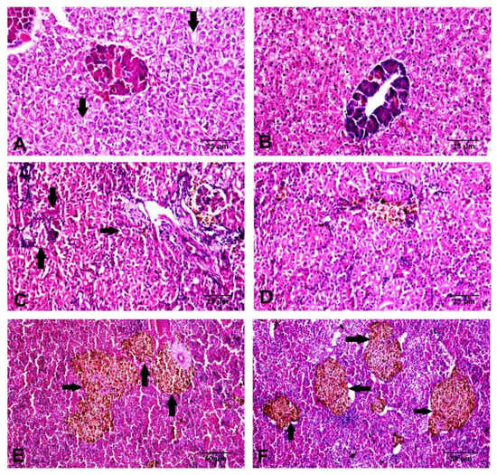 Histological examination of the liver, kidney, and spleen in the control and Hilyses-treated groups. (A). Liver of the control group showing vacuolation of hepatocytes (arrow) (H&E ×400); (B). Liver of the Hilyses-treated group showing normal histological characteristics of hepatocytes (H&E ×400); (C). Kidney of the control group showing necrosis of some renal tubular epithelium (arrow) (H&E ×400); (D). The Hilyses-treated group showing normal histological architecture of the kidney (H&E ×400); (E). Spleen of the control group showing moderate activation of MMCs (arrow) (H&E ×200); (F). Spleen of the treated group showing marked activation of MMCs (arrow) (H&E ×200).
