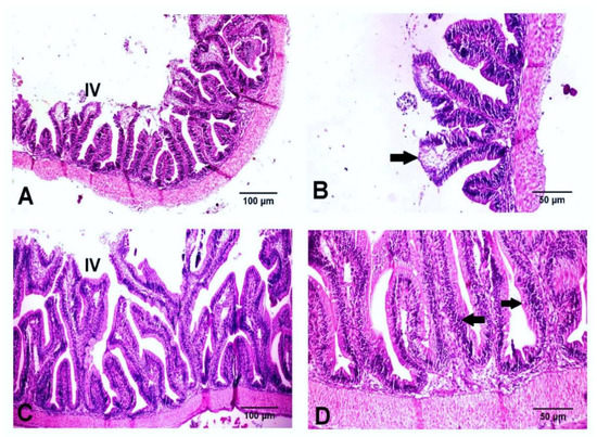 Histological examination of the intestines of the control and Hilyses-treated groups. (A). Control group showing intestinal villi (IV) (H&E ×100); (B). Higher magnification of the previous picture showing sloughing and necrosis of some enterocytes (arrow) (H&E ×200); (C). Hilyses-treated group showing intact intestinal villi (IV) (H&E ×100); (D). Hilyses-treated group showing an intestine with severe hyperplasia of enterocytes (arrow) (H&E ×200).
