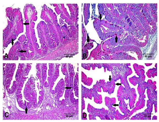 The control group showed a normal histological architecture of the liver, with mild to moderate vacuolar degeneration of hepatocytes (Figure 6A), while the treated group showed mild vacuolation of hepatocytes (Figure 6B). The kidneys revealed mild vacuolar degeneration of renal tubular epithelium with individual cell necrosis, mild depletion of hemopoietic elements and mild activation of melano-macrophage centers MMCs in the control group (Figure 6C). However, the treated group showed a normal histological structure with moderate activation of MMCs (Figure 6D). The spleen showed moderate activation of MMCs (Figure 6E), slight depletion of hemopoietic elements and lymphoidal necrosis. The treated group showed normal hepatic, renal and splenic architecture with marked activation of MMCs (Figure 6F). The intestines of both groups revealed intact mucosal lining of the intestinal villi, with some necrotic enterocytes observed in the control groups (Figure 7). In Alcian blue–PAS-stained intestinal sections, acid mucins-stained bright blue, while neutral mucins stained pink or purple in color. An intermediate color represents mixtures of the two types of mucin. The number of goblet cells stained bright blue with Alcian blue (Figure 8C,D) and pink with PAS (Figure 8A,B) was markedly increased in the Hilyses-treated groups compared with the control group. Figure 9 summarizes the results of villi length and crypt depth in both groups. In the treated group, the lengths of the intestinal villi and the lengths of the crypt depths showed significant increases compared to those of the control group.