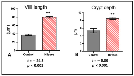 Morphometric analysis of the intestine. (A). Villi length; (B). Crypt depth. The results are expressed as the mean ± S.E. (n = 10) and were analyzed statistically by independent samples t tests, ** statistically highly significant (p < 0.01).