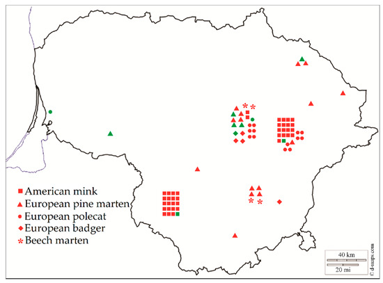 Sarcocystis spp. in the species of Mustelidae in Lithuania. Red color means positive individuals, green color represents negative individuals.