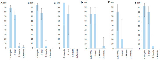Irrespective of the host species, S. bovifelis in the examined samples was identified most often (Figure 2A). The prevalence of S. bovifelis (89.3%) was significantly higher than that of S. cruzi (73.8%, a small effect size), S. hirsuta (3.6%, a large effect size) and S. hominis (1.2%, a large effect size). The prevalence of S. cruzi was significantly higher than that of S. hirsuta (3.6%) and S. hominis (a large effect size both).