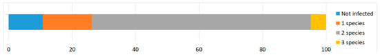 Up to three Sarcocystis spp. were identified in one host individual (Figure 3). No examined Sarcocystis spp. were found in approximately one tenth of the investigated animals (10.7%). The prevalence of single species infections was 15.5%; in all cases when a single species was detected in individual samples, it was S. bovifelis. Two Sarcocystis spp. (69.0%) were most frequently identified in one host individual and in all such cases it was S. cruzi/S. bovifelis co-infection. Three Sarcocystis spp. were confirmed in four animals (4.8%), one European polecat individual, one European pine marten individual and two American minks. In three of these cases, it was S. bovifelis/S. cruzi/S. hirsuta co-infection, in one case—S. bovifelis/S. cruzi/S. hominis co-infection.