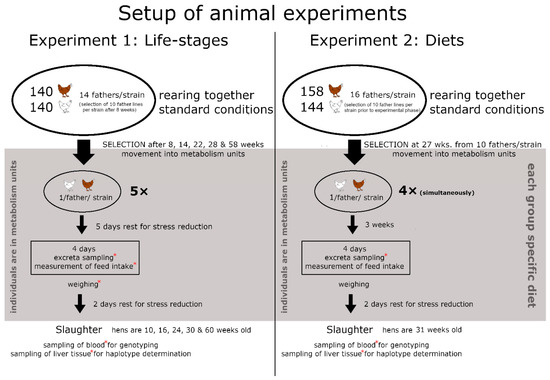 In experiment 1 (Figure 1), the animals were raised as one group in floor pens on deep litter bedding, with diets according to the specific requirements in each period based on soybean and corn meal, but no difference to the recommendations as given in detail within Table 1 in Sommerfeld et al. 2020a [27]. After 8, 14, 22, 28, and 58 weeks 10 hens per father and strain were chosen and moved into the metabolism units (1 m × 1 m × 1 m, arranged in a randomized block design, where 2 units formed one block, each metabolism unit contained one individual) where after five days of rest excreta and feed intake was measured for four days for each individual. Feed was available for ad libitum consumption and no changes in the diet were made. The animals were weighed and after two days of rest the hens were killed by decapitation following anaesthesia using a gas mixture [32] and samples of blood and liver tissue were taken, thus the hens were 10, 16, 24, 30, and 60 weeks old. In the following the five sampling points will be named as period 1 to period 5.