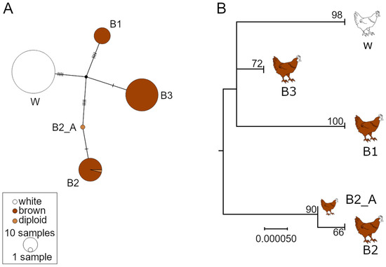 Evolutionary relationship of the mitochondrial genome of laying hens. (A) Haplotype network (TCS algorithm) and (B) maximum likelihood tree based on the mitochondrial genome (16,784 bp) of 180 laying hens. The tree is based on Hasegawa–Kishino–Yano model with 500 bootstrap replicates and includes all sites.