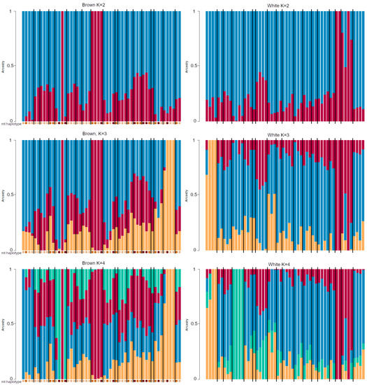 ADMIXTURE plots of the brown and white strain analyzed and filtered separately. Lines separate groups of individuals sharing the same father. Dots under the plots of brown individuals mark the different mt haplotypes.