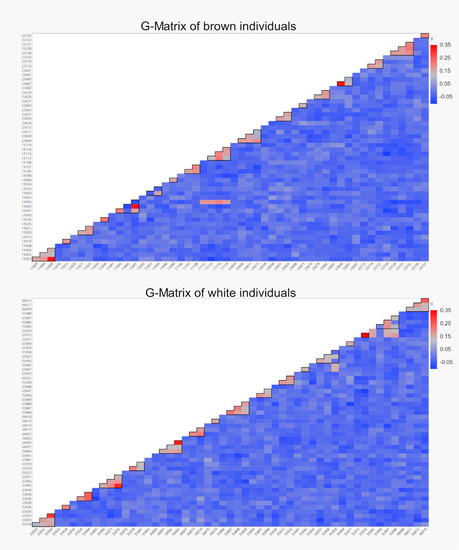 The genomic relationship (g) within the two strains did not differ, ranging from −0.1 to 0.34 in the brown and −0.09 to 0.35 in the white strain (Figure 4).
