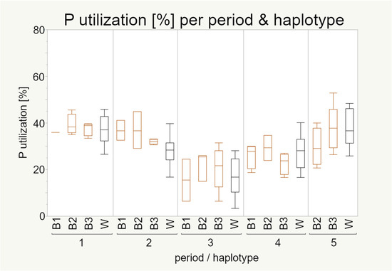 In experiment 1 the P utilization decreased from the first towards the third period, and increased afterwards for all haplotypes (Figure 5). The differences between the highest P utilization (period 1 and 5) to the lowest P utilization (period 3) were significant (Table A2).