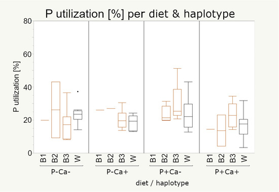 To detect significant differences in body weight, feed intake and P utilization between the haplotypes within the periods (and for P utilization within the diets of experiment 2), pairwise Tukey–Kramer HSD or Steel–Dwass tests were performed using JMP Pro (Version 15. SAS Institute Inc., Cary, NC, USA, 1989–2019) after testing for normality using Shapiro–Wilk test.