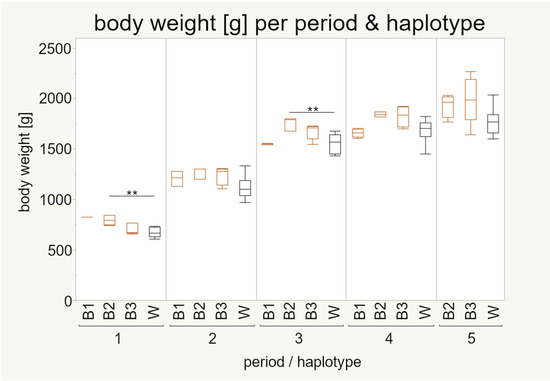 p-values of the comparison of body weight of the different haplotypes per period. Pairwise Tukey–Kramer HSD or Steel–Dwass tests were used for testing depending on the distribution of the data.