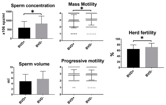 Differences in sperm parameters and fertility between bovine viral diarrhea (BVD)-positive and BVD-negative bulls. Mean and SEM of seminal parameters and herd fertility of BVD-positive and -negative bulls. * indicates statistically significant differences, t-test (p < 0.05).