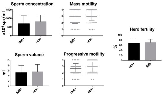Bull age was excluded as a variable that could affect the results because no statistically significant differences were found between BVD+ (3.35 ± 0.32 years) and BVD- bulls (4.06 ± 0.18 years); or between IBR+ (3.67 ± 0.26 years) and IBR- bulls (3.99 ± 0.19 years) (t-test).