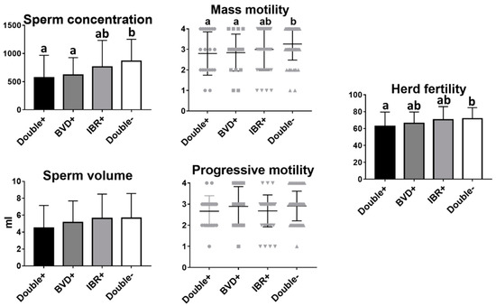 Analysis of sperm parameters and fertility in BVD- and/or IBR-positive and -negative bulls. Mean and SEM of seminal parameters and herd fertility of bulls infected with both BVD and IBR, BVD-only, IBR-only, and negative bulls. Different letters indicate statistically significant differences, One-way ANOVA (p < 0.05).