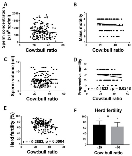A significant negative correlation (r = −0.1833) between progressive motility and the number of cows per bull (ranging from 15 to 51) was found. Although sperm concentration and mass motility were lower when the number of cows per bull increased, no differences were found between sperm volume, concentration, and mass motility and the cow: bull ratio (p > 0.05). However, there was a statistically significant negative correlation between herd fertility (r = −0.2853) and the number of cows per bull. Interestingly, when herds had more than 40 cows per bull, the negative effect on fertility was statistically significant (Figure 4F). A significant negative correlation between herd fertility and the number of cows per bull was also observed when only BVD-negative bulls were included in the analysis (r = −0.2936; p = 0.002), excluding a possible effect of BVD infection on this analysis.