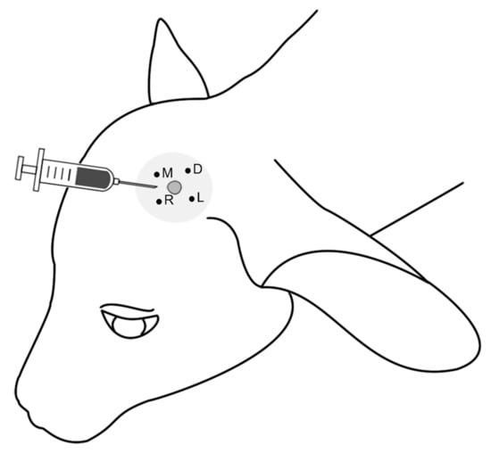 Locations used for the assessment of the mechanical nociceptive threshold (R: rostral, M: medial, L: lateral, D: dorsal). All four locations were used with the pressure algometer, only the lateral one with the von Frey filaments. The syringe indicates the direction of the saline, clove oil or isoeugenol injection.