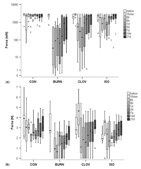 Mechanical nociceptive threshold (MNT) measured with von Frey filaments (applied force in mN, (a), logarithmic scale) or a pressure algometer (applied force in N, (b)) in the four different treatments—injection of saline (CON), clove oil (CLOV), isoeugenol (ISO) or disbudding with a hot iron (BURN). The boxplots represent the mean MNT across the different locations of measurement at different time points. No measurement exists for BURN at 15 min due to sedation. The box-and-whisker-plots show the median (line in box), 25 and 75% quartile (bottom and top end of the box) and minimum and maximum (whiskers) except for outliers (circles, distance to box 1.5–3 times the interquartile range) and extreme values (asterisks, distance to box > 3 times the interquartile range).
