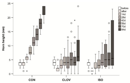Horn height (in mm) of the calves in the three injection groups—saline (CON), clove oil (CLOV) and isoeugenol (ISO)—shown for different time points until week 12. The decrease at time point after in CLOV and ISO is due to swellings around the horn buds after the injection. The hot-iron treatment is not included, as no horn growth occurred. The maximum sample size was 20 horns for all treatments (2 horns/animal) at each time point; due to missing data the actual sample size was as follows: CON: 14/18/20/20/20/18/16/10; CLOV: 16/14/17/13/18/19/17/12; ISO: 16/12/20/20/19/20/16/10. The box-and-whisker-plots show the median (line in box), 25 and 75% quartile (bottom and top end of the box) and minimum and maximum (whiskers) except for outliers (circles, distance to box 1.5–3 times the interquartile range) and extreme values (asterisks, distance to box > 3 times the interquartile range).