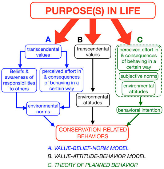 The content of individuals’ purpose(s) is also very much understudied. This circumstance may be attributable to thinking the range of purposes that could exist is strongly regulated by an individual’s culture; consequently, studying the content of purpose and passing normative judgment on the content of one’s purpose is of “minimal utility” for psychological inquiry [55,68]. The robustness of that explanation of the circumstance is far less important than the circumstance itself, i.e., the content of individuals’ purpose is not well studied in psychology—especially as the subject may pertain to understanding why individuals vary in the expression of pro-conservation behaviors.