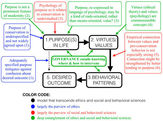 The black portions of Figure 3 depict a simplified model of human behavior that synthesizes insight from virtue ethics and behavioral science. Inside the black portion of Figure 3, one finds good governance represented as knowing where and how to intervene on behavior-related processes (and by implication when to refrain from intervening). Outside the black portions of Figure 3 are indications of how normative ethics and empirical science commingle in the service of conservation governance. Most importantly, we see indications that (i) the capacity to predict behavior may be advanced by empirical inquiry focused on the role that purpose plays in shaping behavior and (ii) the development of purpose (for an individual or group of individuals) entails a strong and inescapably normative element. These indications are more fully explored in subsequent sections.