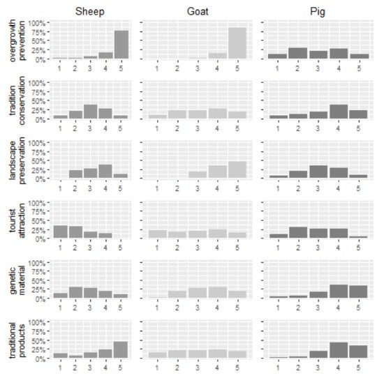 Farmers’ perceptions of environmental or social benefits arising from rearing local breeds by species are shown in Figure 1. While responses are broadly evenly distributed over the different categories, farmers most notably associate local goat and sheep breeds with the conservation of grassland use and traditional landscapes in marginal agricultural areas. Local pig and sheep breeds are also viewed positively with regard to the elaboration of traditional products, revealing their gastronomic potential.