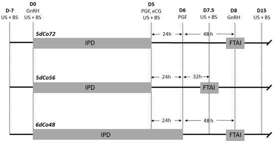 The protocol 5dCo72 was performed as described [8]. Briefly, it consisted of intramuscular administration of 100 μg GnRH (Cystoreline® CEVA Santé Animale SA, Libourne, France) and insertion of a 1.55-g IPD (PRID-delta®, CEVA) on Day 0. On Day 55, 25 mg dinoprost (Enzaprost T®, CEVA) and 500 I.U. eCG (Syncrostim® 500 I.U., CEVA) were administered intramuscularly, and the progesterone device was removed. The 500IU eCG dosage was decided based on drug management guidance for Syncrostim® (SPC product: F-DVM-01-03). This dosage has been demonstrated to be safe and not associated with increased rate of multiple ovulation [33]. On Day 6, 25 mg prostaglandin was administered intramuscularly. On Day 8, 72 h after removal of the intravaginal progesterone device, FTAI was performed and 100 μg GnRH was administered intramuscularly. The 5dCo56 protocol was identical to 5dCo72, except that FTAI and GnRH treatment were performed at 56 h after removal of the progesterone device. The 6dCo48 protocol was identical to 5dCo72, except that the progesterone device was removed on Day 6, simultaneously with the second prostaglandin administration (Figure 1).