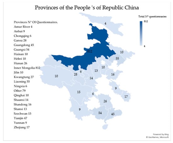 Map showing the collection points from the 23 provinces of the People ‘s of Republic China and the number of questionnaires collected (total N of questionnaries = 1301) [29].