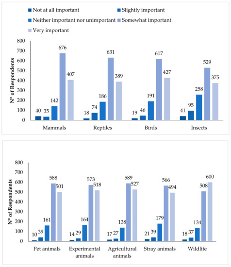 In order to investigate the relative attitudes towards different species, respondents were asked how important it is that different animal groups are cared for (Figure 2 and Appendix Table A1). More than 80% thought it was somewhat or very important that mammals, reptiles and birds are well cared for and over 68% responded similarly for insects (Figure 2). In terms of different animal use contexts, the care of pet animals, experimental animals, agricultural animals, stray animals and wildlife were all reported to be somewhat or very important, by over 83% of respondents (Figure 2). Very few respondents answered that being well cared for was ‘not at all important’ for any of the animal groups listed. Respondents considered that it was more important that mammals should be cared for than other animal groups (between p < 0.03 and p < 0.0001) (Appendix Table A2).