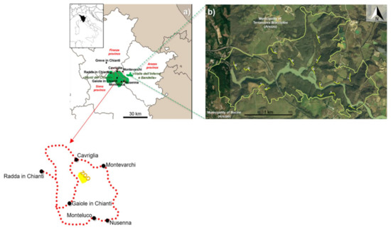 Our study area (about 9000 hectares) included a hilly area in Central Italy (Chianti hills and Valdarno provinces of Arezzo, Siena and Florence), with two Special Areas of Conservation (SAC) included in a network of nature protection areas within the European Union called Natura2000 (following the Habitats Directive 92/43/EEC and the Bird Directive 79/409/EEC). SACs covered over the 75% of the surveyed area (Special Area of Conservation (SAC): IT5190002 “Monti del Chianti” and IT5180012 “Valle dell’Inferno e Bandella”). The SAC “Monti del Chianti” (about 7500 hectares) is included in the Chianti hills area, mostly covered with deciduous woodlands (Quercus cerris, Quercus pubescens, Castanea sativa: 38%) alternated with vineyards (27%), surrounded by scrublands (11%) and fallows (mostly with Bromus erectus: 14%), with rare human settlements (8%) and coniferous woodlands (2%). Wild ungulate assembly includes roe deer Capreolus capreolus, wild boar Sus scrofa and introduced red deer Cervus elaphus and fallow deer Dama dama; the only large carnivore in this study area is the grey wolf Canis lupus. The former zoological garden of Cavriglia hosts currently a camping area (“Camping Orlando”) and several abandoned buildings and precincts [46]. The SAC “Valle dell’Inferno e Bandella” (about 531 hectares) is also a Regional Natural Reserve and is located along the Arno river (municipalities of Bucine and Terranuova Bracciolini, province of Arezzo). This area is all covered by patches of deciduous woodlands (Quercus cerris, Quercus robur, Carpinus betulus, Salix spp. and Populus spp.: 45%), wetlands/riverine vegetation (22%), scrublands (8%) and farmlands (23%), with scattered human settlements (2%). The wild ungulate guild of this area includes the wild boar, the roe deer and the fallow deer; furthermore, feral domestic pigs Sus scrofa domestica are also reported.