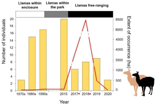 Trends of population size (bars: minimum number of individuals) and extent of occurrence (red line) of the llama population. Population data between 1970 and 2017 were taken from published literature [46]. Llamas lived in an enclosure within the park in the 1970s–1990s (llamas within enclosure), then outside the cage but still within the zoo up to 2016 (llamas within the park) and then outside the zoo park borders. Asterisks mark years with known reproduction events in the wild (i.e., photos of juveniles or suckling cubs). Dashes within the red line reflect dashes in the right y-axis.