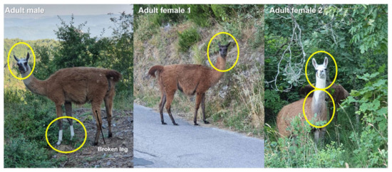 The last three individual llamas observed in January–August 2020 (photo Carlo Gargioni). Circles show individual diagnostic features.