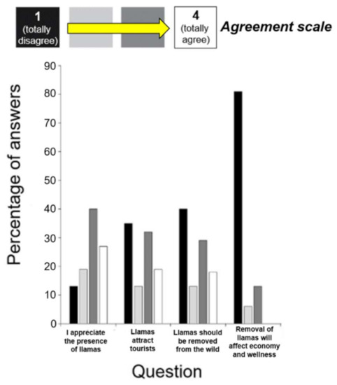 Frequency of answers to the survey on social perception: questions 1–2) social perception; questions 3–4) attitudes toward local removal of llamas.