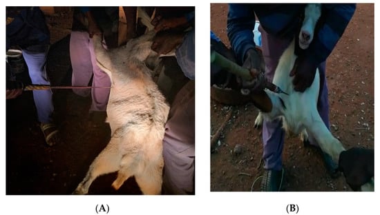 In 2018, FAOSTAT [] estimated the world’s total goat population at 1 × 109, with 40% of the population found in Africa. Southern Africa contribute 2% of Africa’s goat population and 50% of that are found in South Africa []. Half of South Africas’ smallholder households own goats, and more than 95% of goats are sold in the informal market for religious and cultural purposes []. When performing cultural practices, resource-limited households slaughter goats using indigenous methods [,], which have cultural meaning to them. The welfare of animals at commercial slaughterhouses is governed by the South African Meat Safety Act of 2000, which promotes stunning before exsanguination to ensure that animals are unconscious and experience minimal pain and suffering []. However, the Act accepts indigenous slaughter methods when done for personal use and cultural purposes. Indigenous slaughter methods include the transverse neck incision (TNI), suprasternal notch piercing (SNP) and the under shoulder blade piercing at the chest floor point of elbow (CFP) to the direction of the heart []. Cultural beliefs invoked when slaughtering goats using indigenous methods include celebrating circumcision, marriages and births, venerating ancestors, avenging evil spirits, and performing a ritual during funerals [,]. Immediately after slaughter and dressing, in most cases, the carcass is hanged with a metal hock in an empty room for 24 h for them to cool slowly, tenderize, dry and allow maximum blood loss. Such is important to resource-limited farmers because consuming meat with blood is prohibited, as it is believed that ancestral spirits do not accept meat with blood []. Offals are cleaned and consumed on the day of slaughter as they are highly perishable. Although indigenous slaughter methods have cultural meaning, therefore, approved by the Meat Safety Act of 2000, they affect the welfare and the meat physico-chemical characteristics of goats.