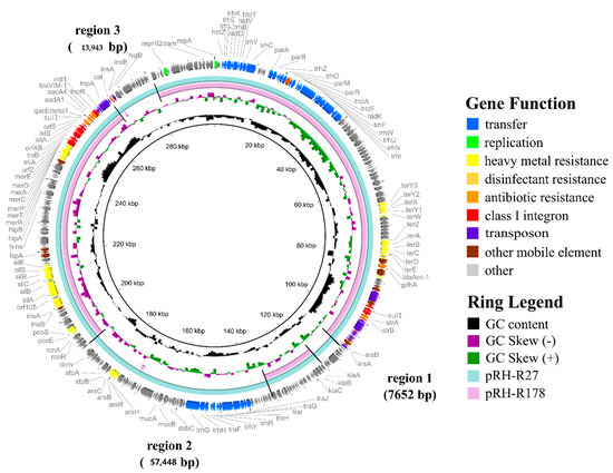 Comparative plasmid maps of pRH-R27 from Salmonella enterica and pRH-R178 from Escherichia coli. Deleted regions (1–3) are indicated on the map and pRH-R27 was used as reference. All sequences show >95% DNA sequence identity. Coloured regions represent functions and features indicated in the figure legend. The IncHI2 plasmid harbored by S. Infantis (pRH-R27) isolated from a livestock farm in Germany carries antibiotic resistance genes (blaVIM-1, aacA4, aadA1, sul1, blaACC-1, strA/strB, and catA1), disinfectant resistance (qacEΔ1) and heavy metal resistance (ter-, mer-, sil-, ars-, rcn-, and pco). The figure was reproduced with permission from [47].