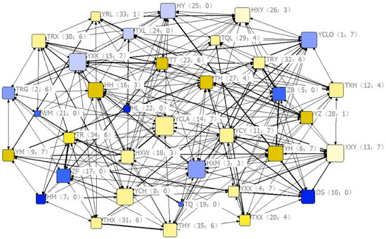 Eigenvector centrality coefficients of group members in the social network. Nodes represent individuals; females and males are shown in yellow and blue tones, respectively; tone gradient (from lowest to highest) indicates age class (1–4); labels represent the name of each individual; node size is proportional to social centrality; the thickness of the links represents its association index in the social network; the numbers inside each pair of brackets indicate social rank and number of relatives, respectively.