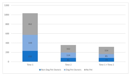 At Time 1, 55.3% (n = 571) participants had a pet, and of those, 59.4% (n = 339) had a dog. At Time 2, 54.2% (n = 195) participants had a pet, and of those, 58.5% (n = 114) had a dog. Of the 318 participants who had data for both time points, 164 (51.6%) had a pet at both time points, 121 (38.1%) did not have a pet at either time point. Some of these participants lost (3.5%) or acquired (3.8%) a pet between Time 1 and Time 2; 10 participants had missing data for pet ownership. Of the 164 participants with a pet at both time points, 85 of them (55.9% of pet owners, 26.7% of overall sample) had a dog at both time points. See Figure 1 for pet ownership proportions.