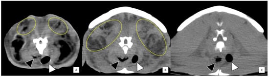 Transverse computed tomographic studies showing heterogeneous soft tissue density (yellow circled areas) consistent with steatitis in the cranial cervical region (A) and pre-scapular region (B) of two Kemp’s ridley sea turtles (Lepidochelys kempii). (C) The same turtle shown in (B) at approximately the same anatomic location after resolution of disease four months later. Black arrowhead: esophagus, white arrowhead: trachea.
