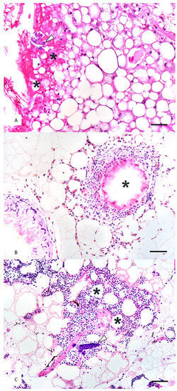 Tissue sections of fat from Kemp’s ridley sea turtles (Lepidochelys kempii) with steatitis. Hematoxylin and eosin. (A) A cluster of bacteria (arrowhead) is present within an area of necrotic fat and degenerate heterophils (asterisks). Hematoxylin and eosin. ×40 objective. Scale bar = 50 µm. (B) Heterophils and macrophages surround necrotic fat (asterisk). A more chronic area of steatitis is present in the lower left as a granuloma composed of multinucleated giant cells formed around ceroid. Hematoxylin and eosin. ×20 objective. Scale bar = 150 µm. (C) A bacterial embolus (arrowhead) is within an area of fat necrosis, hemorrhage, and heterophilic inflammation (asterisks). ×20 objective. Scale bar = 170 µm.