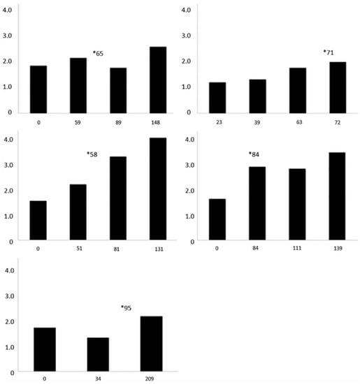 Thiobarbituric acid reactive substances (TBARS) plasma concentrations over time in individual cold-stunned Kemp’s ridley sea turtles (Lepidochelys kempii) with steatitis. The X-axis is days of rehabilitation, and the Y-axis is plasma TBARS concentrations in nmol/g. * represents the day of diagnosis of steatitis.