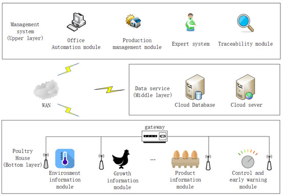 The upper layer is a software management system that provides a good visual interface. The management system is divided into an office automation module, a production management module, an expert system, and a traceability module. As for the middle layer, the cloud database is used to store the data and information generated by the upper layer and the bottom layer, and at the same time construct a reasonable network environment to solve mutual communication problems by configuring the underlying server. At the bottom layer, in poultry house(s), environmental sensors, Wi-Fi receiving and transmitting devices, and single-chip microcomputers can be configured to timely acquire and transmit environmental information and poultry individual information (including poultry weight information, feed intake data information, drinking water data information, poultry egg quality information, etc.). Ventilation fans, evaporative cooling pads, heaters, and other equipment placed in the poultry house to regulate environmental parameters such as temperature and humidity in the house.