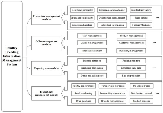 Modern poultry farming companies need a complete management system to assist companies in managing their daily production activities. The system should cover such things as personnel office management, purchase–sales–inventory management, environmental monitoring and control in poultry houses, and monitoring of individual poultry information. At the same time, it also needs to include traceability management of products, diagnosis, and early warning of poultry diseases to meet the need for future development.