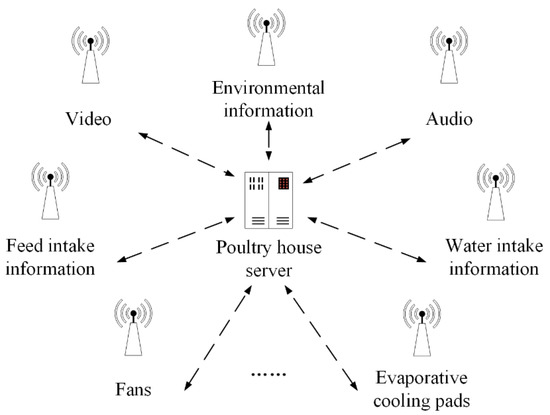 An environmental parameter information sensor (including temperature and humidity sensor, ammonia sensor, carbon dioxide sensor, hydrogen sulfide sensor, light intensity sensor, etc.), feed intake data monitoring module, drinking water data monitoring module, video monitoring system, fans, evaporative cooling pads, heaters, feeding, and manure cleaning facilities in the poultry house together form the local area network system in the house. This section mainly reports the information transmission methods, local transmission strategies, and configuration of network nodes in poultry houses.
