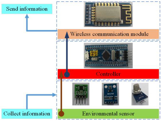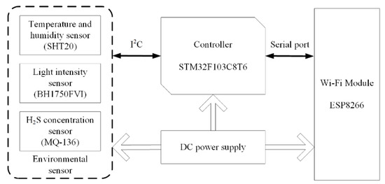As the terminal node of the wireless sensor network, the environmental information sensing unit (EISU) in the poultry house should contain various digital environmental sensors, such as temperature and humidity sensors, carbon dioxide concentration sensors, hydrogen sulfide concentration sensors, light intensity sensors, wind speed sensors, etc., and it should also be equipped with a micro processor and wireless transmission module. The structure diagram is shown in Figure 4, and the performance parameters of the environmental sensors used are shown in Table 3, which are provided by the manufacturer.